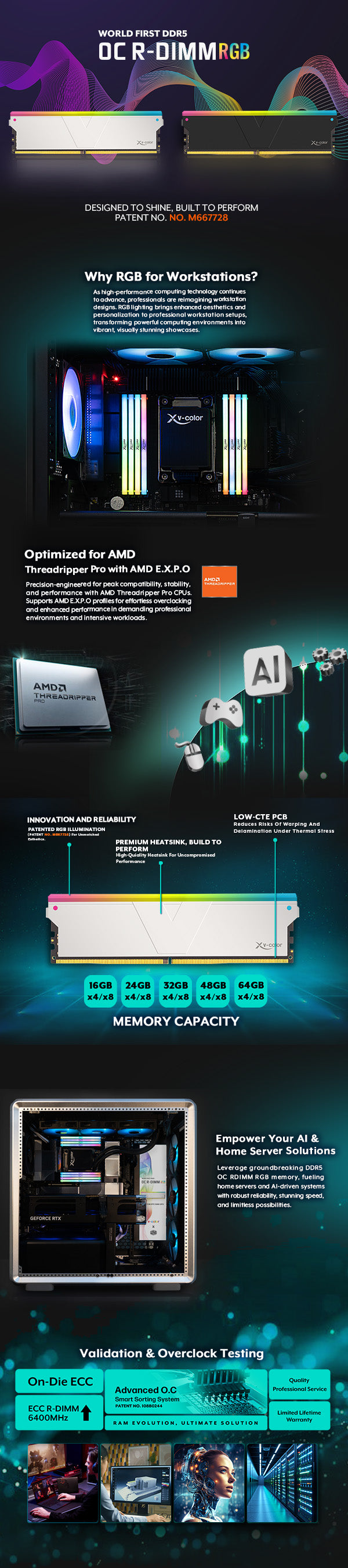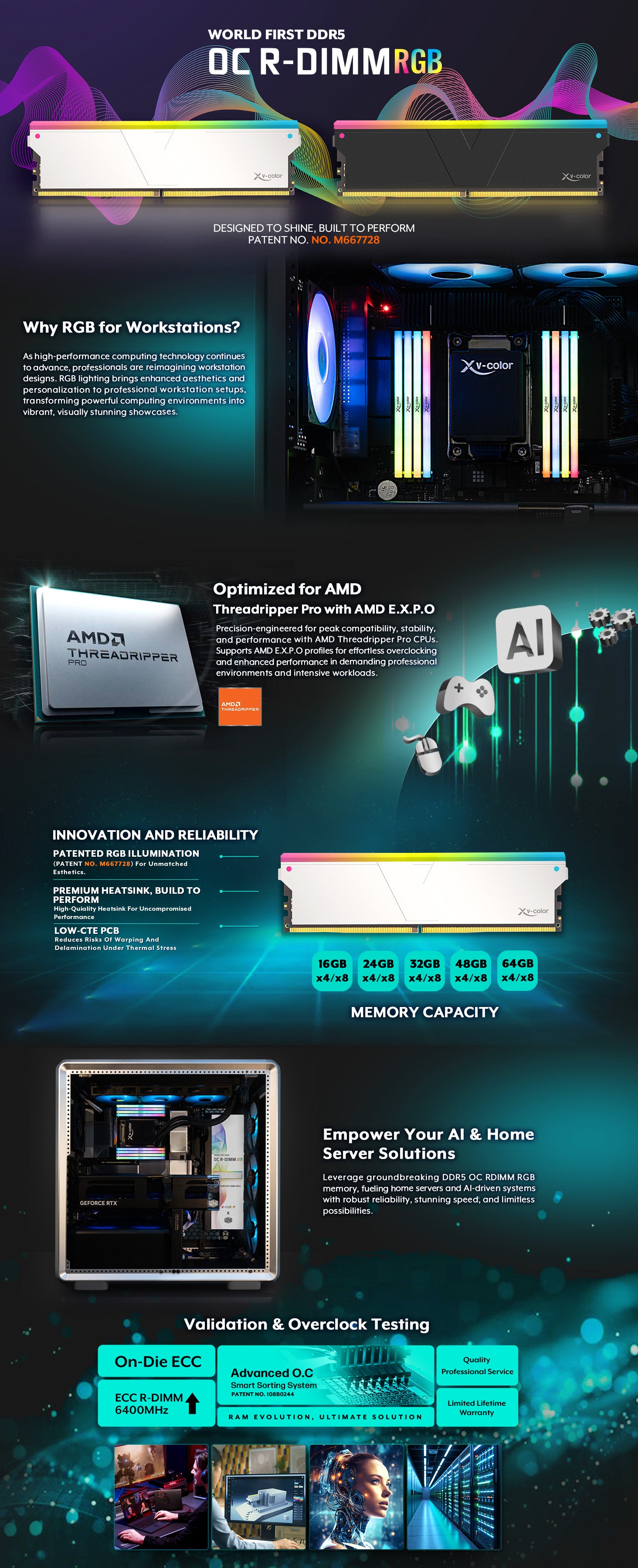 Our DDR5 OC R-DIMM RGB Workstation Memory is compatible with all major platforms: TRX50, WRX90, and W790. Engineered for maximum performance, it offers ultra-low latency solutions for fast response times, with enhanced RGB lighting on each module for a unique, eye-catching aesthetic — ideal for server use, AI training, and overclocking enthusiasts. Featuring high-quality Hynix ICs, the memory undergoes rigorous audits and is built on a 10-layer thick PCB for exceptional reliability. Each IC is tested using v-color's exclusive automated sorting technology.