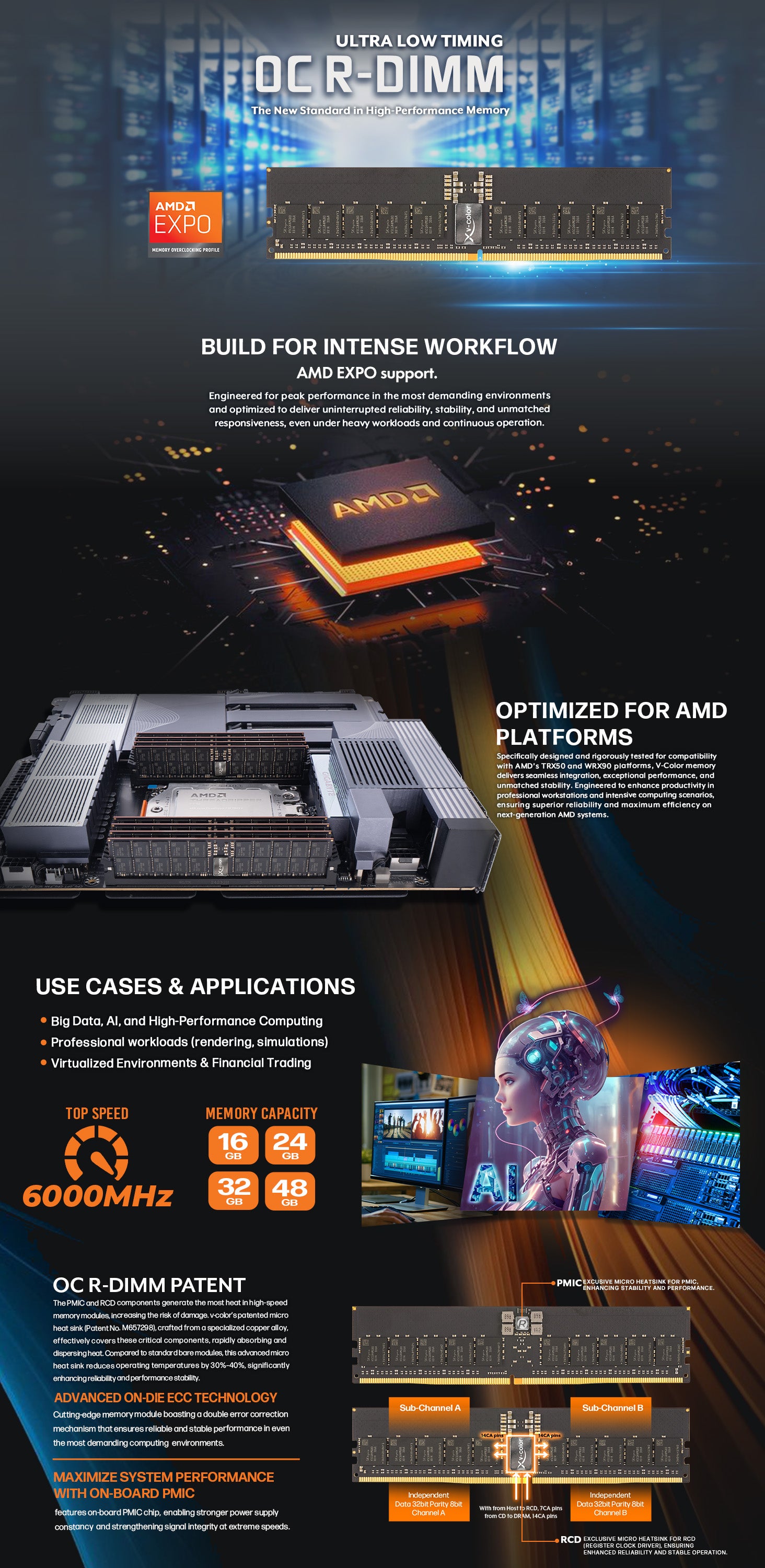 Our DDR5 Ultra Low-Timing OC R-DIMM Workstation Memory is compatible with all major platforms: TRX50, WRX90, and W790. Engineered for maximum performance, it offers ultra-low latency for fast response times, ideal for server use, AI training, and overclocking enthusiasts. Featuring high-quality Hynix ICs, the memory undergoes rigorous audits and is built on a 10-layer thick PCB for exceptional reliability. Rach IC is tested using v-color's exclusive automated sorting technology.